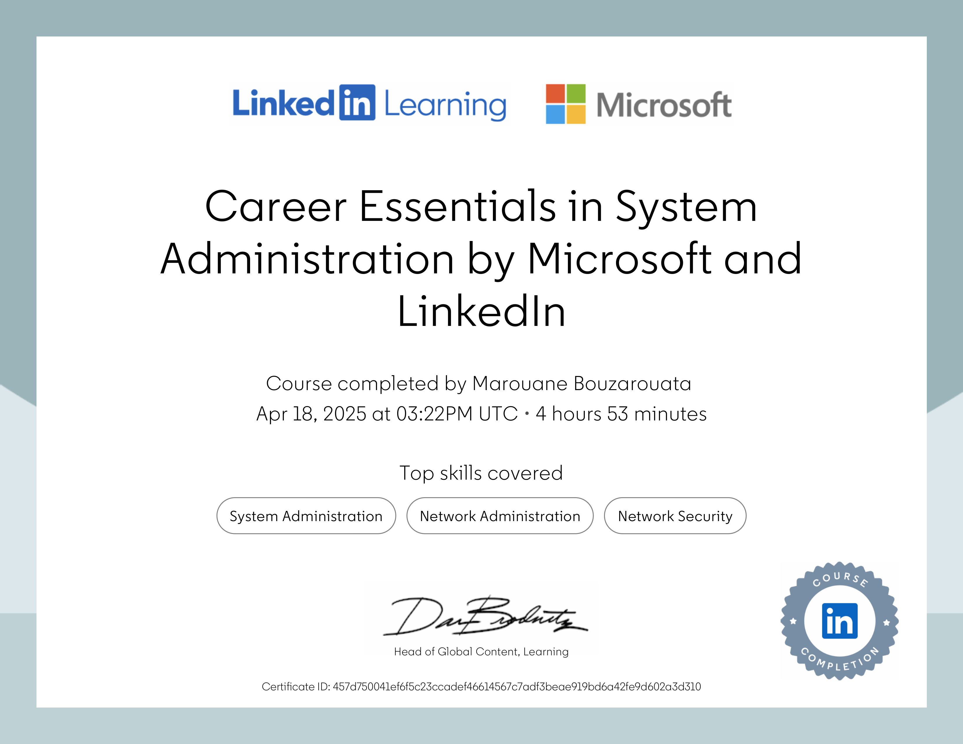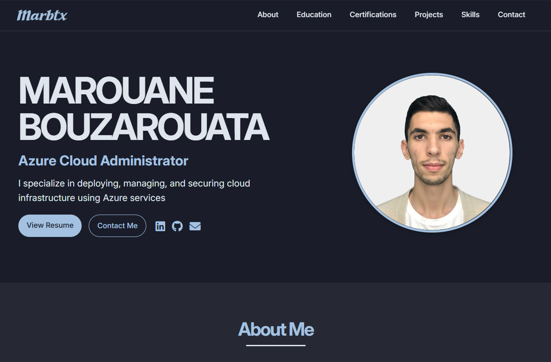 Hi, I'm Marouane Bouzarouata, an Azure Cloud Administrator with a strong foundation in Microsoft Azure, Networking, and System Administration. I specialize in deploying, managing, and securing cloud infrastructure using Azure services. My expertise includes configuring virtual networks, managing identities with Azure AD, and monitoring resources to ensure high availability and performance.