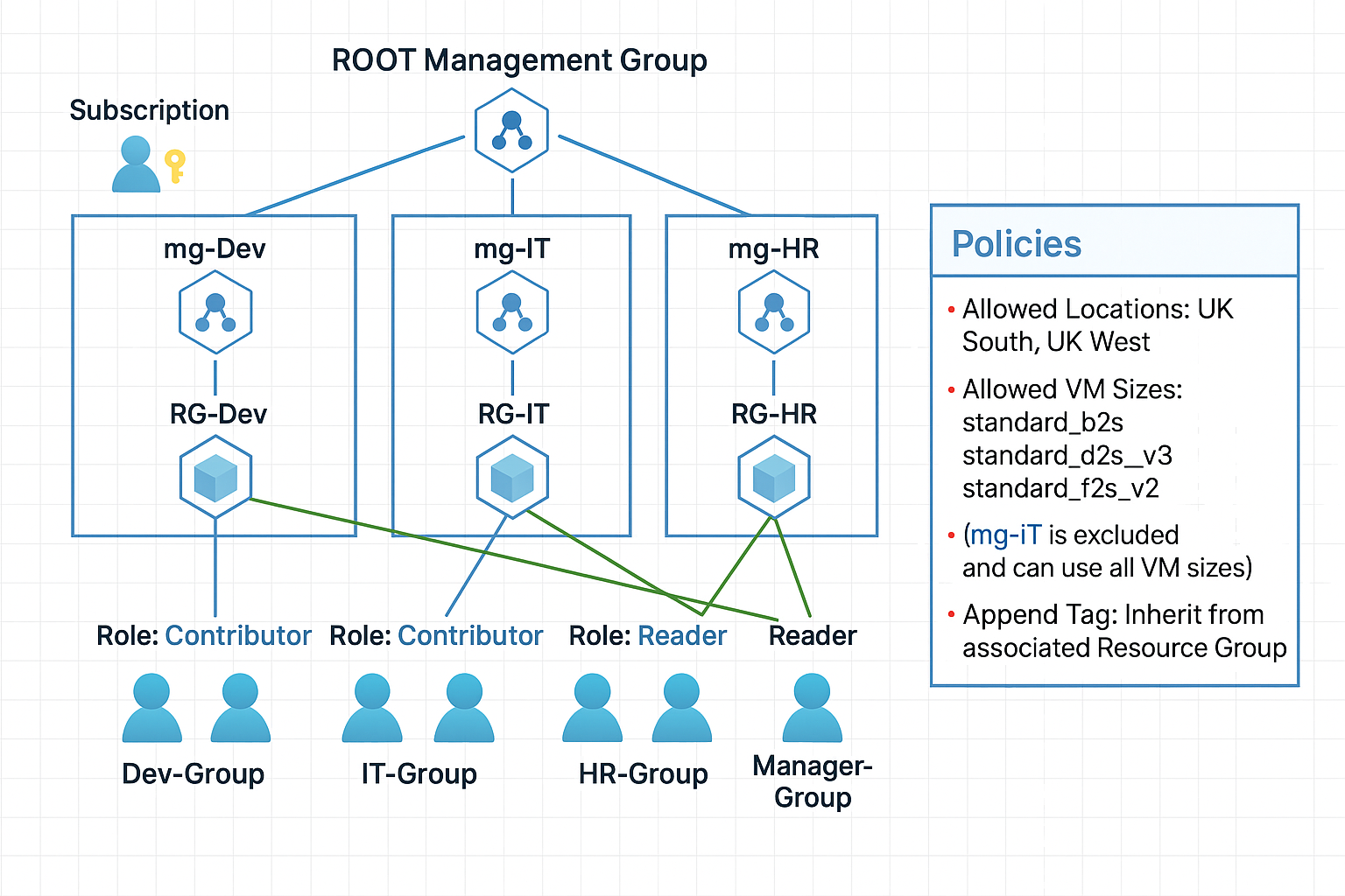 Designed a full-featured Azure governance structure to simulate enterprise-grade cloud control. This project enforces secure role-based access, resource standardization, and cost tracking using management groups